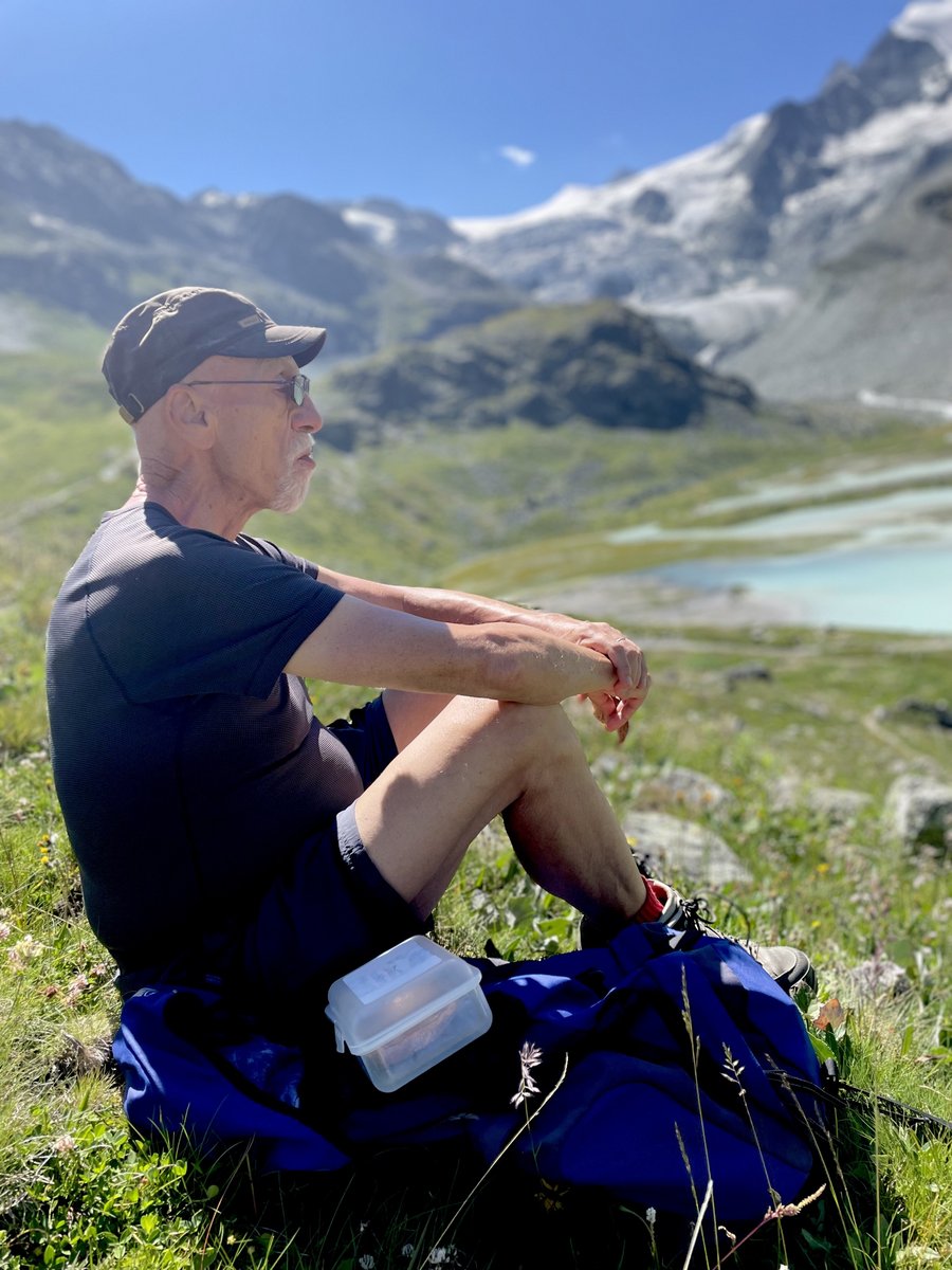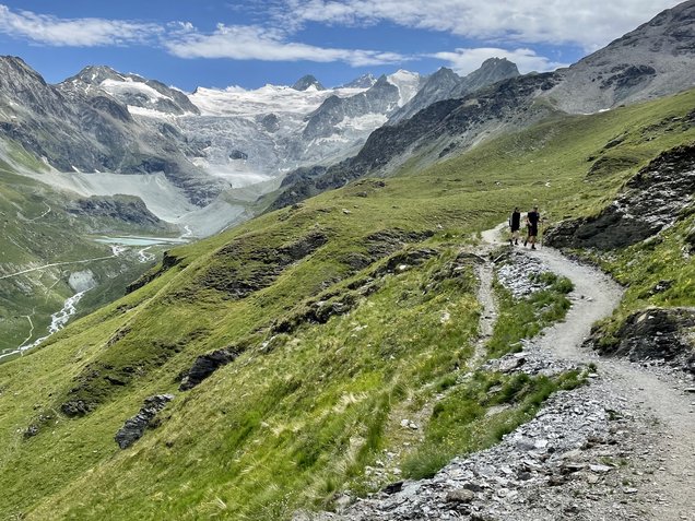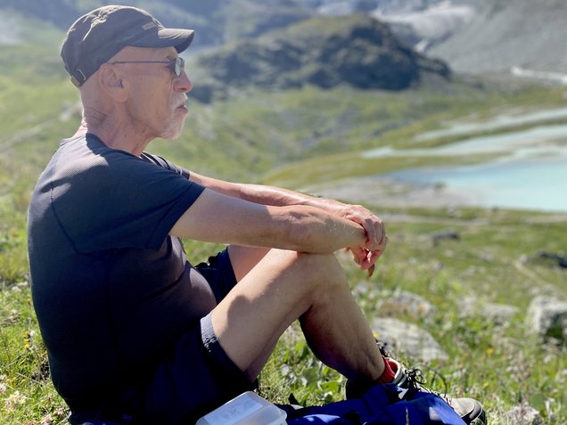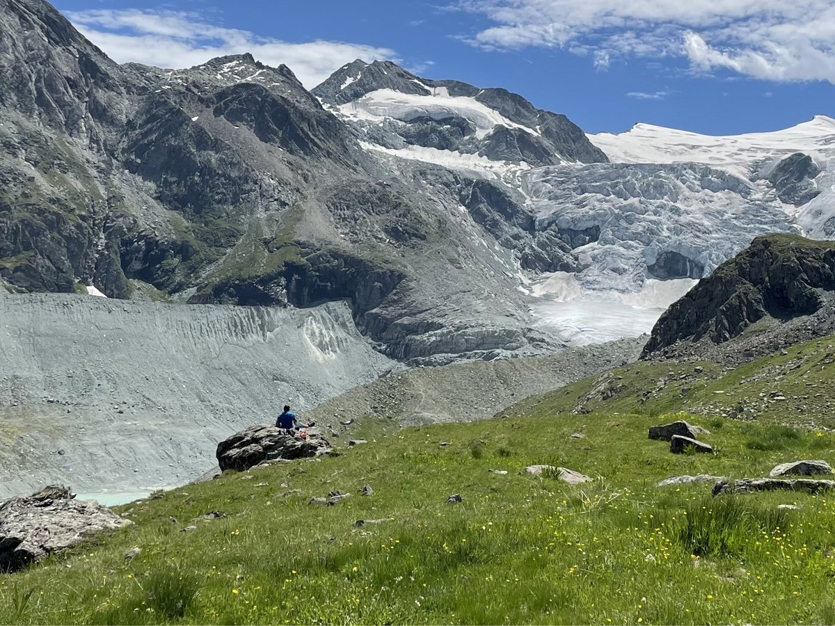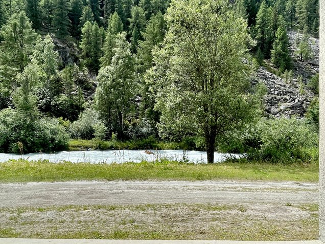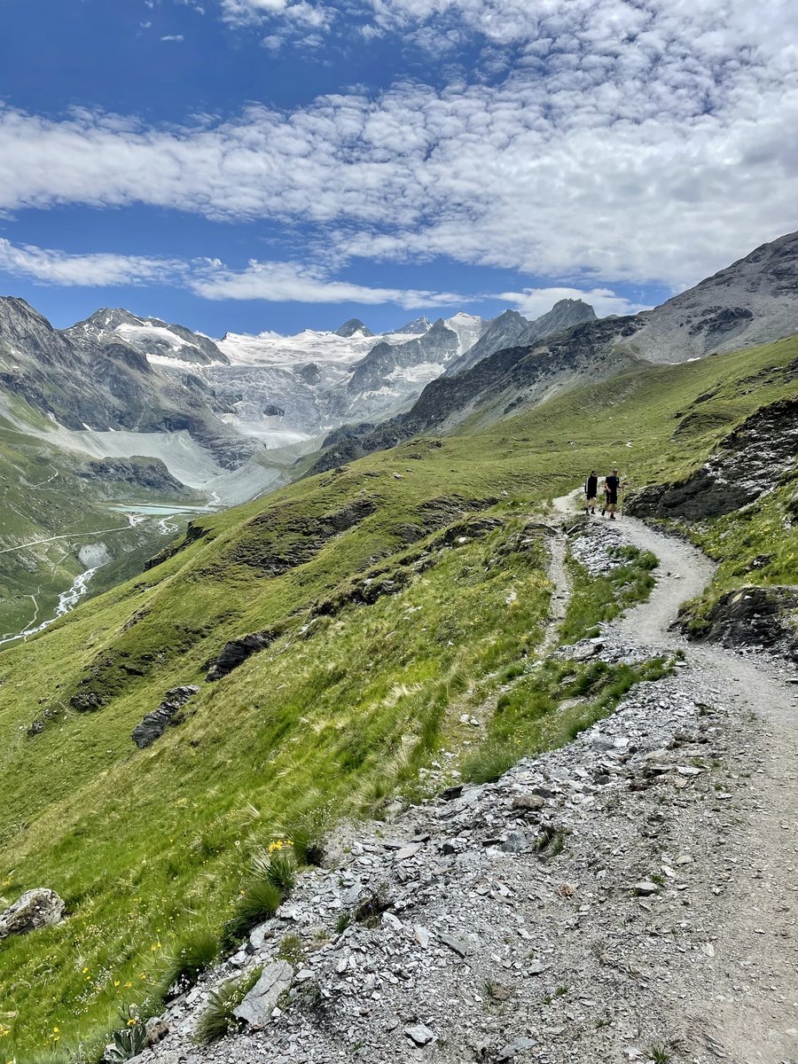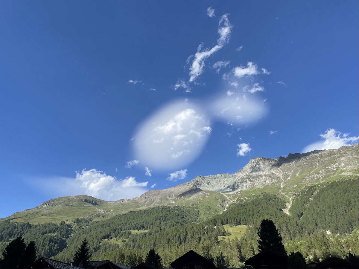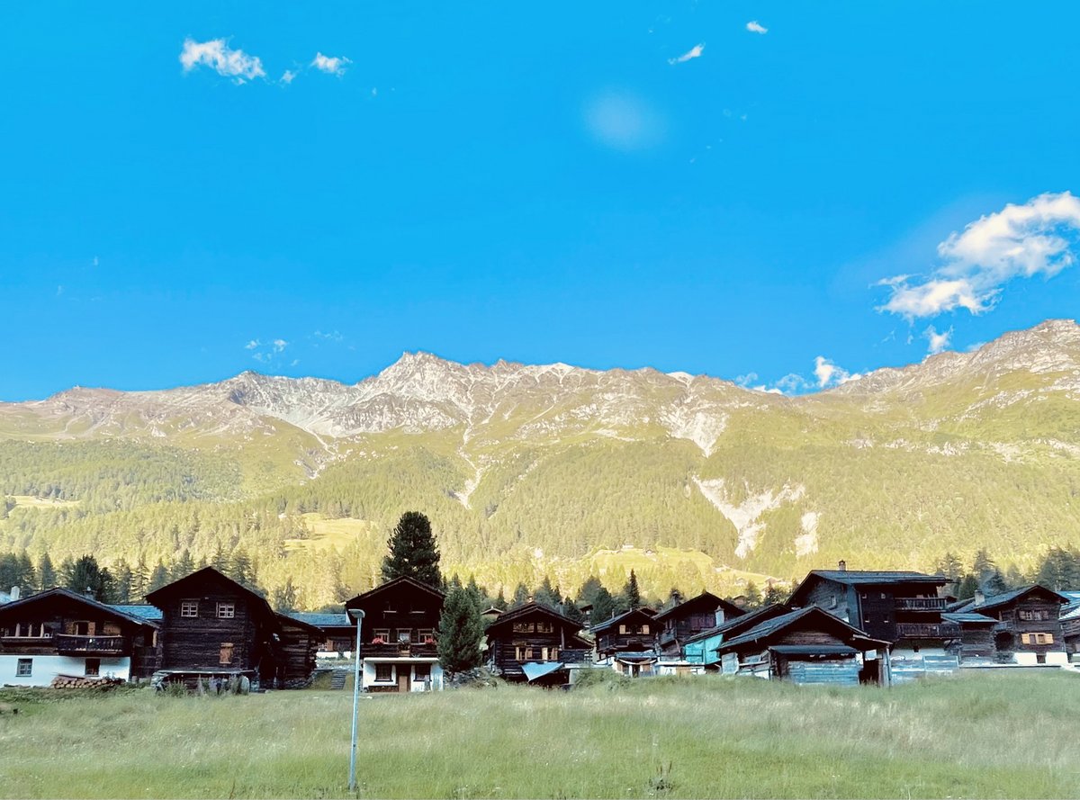 Ein Bergdorf vor sonnenbeschienenen Bergen