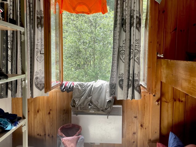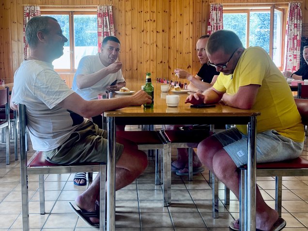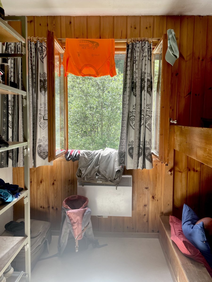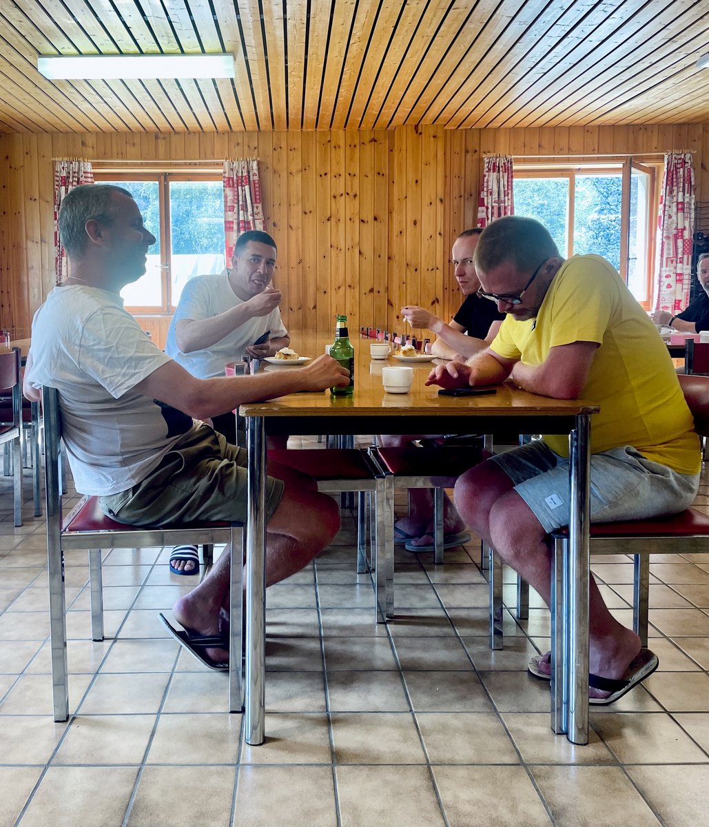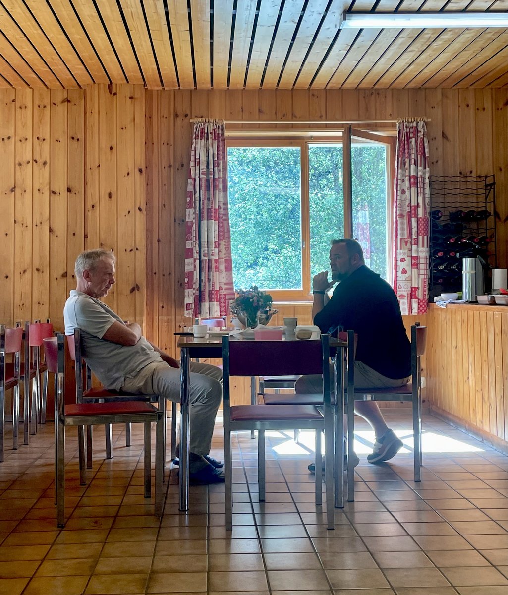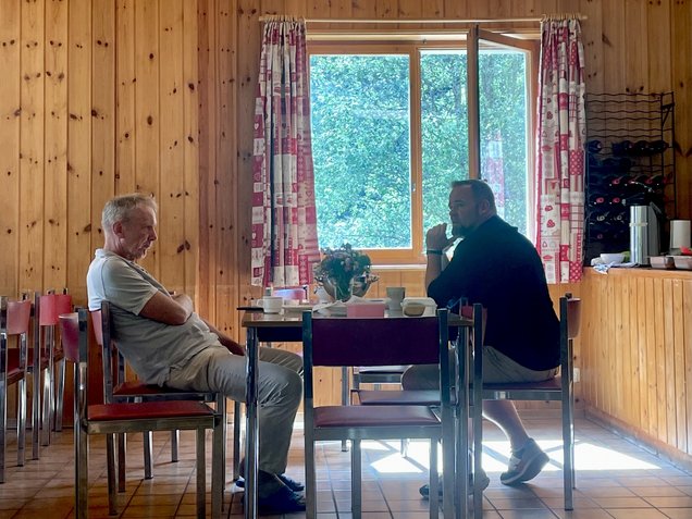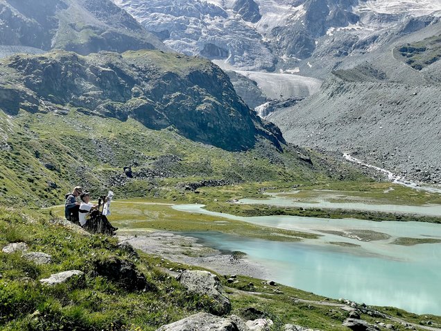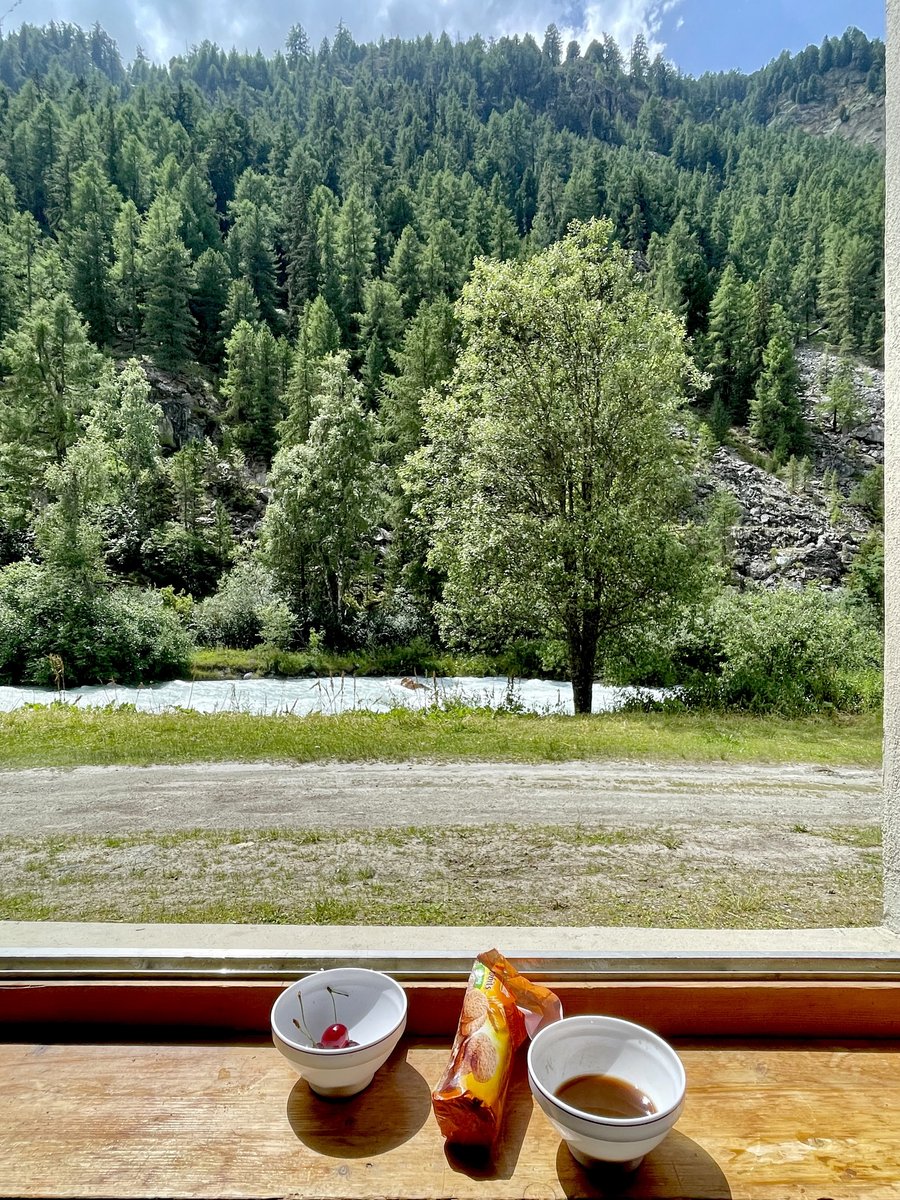 Ein Bergdorf vor sonnenbeschienenen Bergen